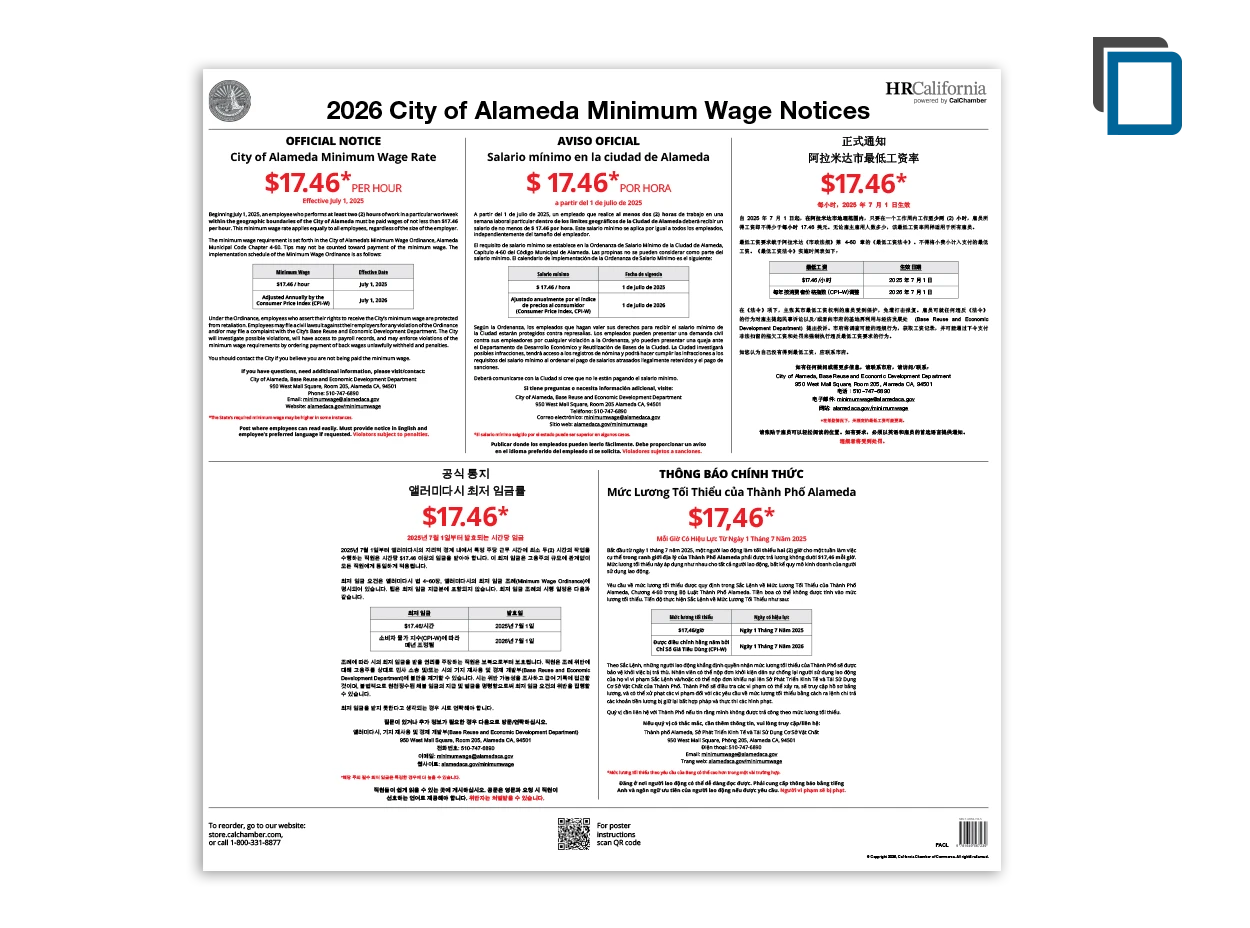 CalChamber’s 24” x 24” Alameda Minimum Wage poster (English, Spanish, Chinese, Korean and Vietnamese combined) contains the official City of Alameda Minimum Wage Notice.