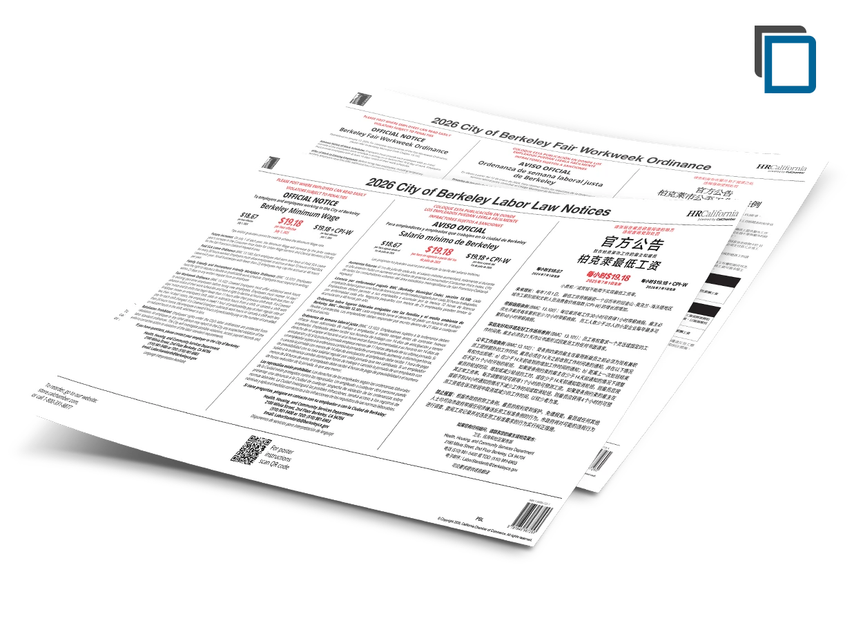 CalChamber’s 24” x 14” Berkeley Labor Law Poster (English, Spanish and Chinese combined) contains these official employment notices required by the City of Berkeley ordinances: