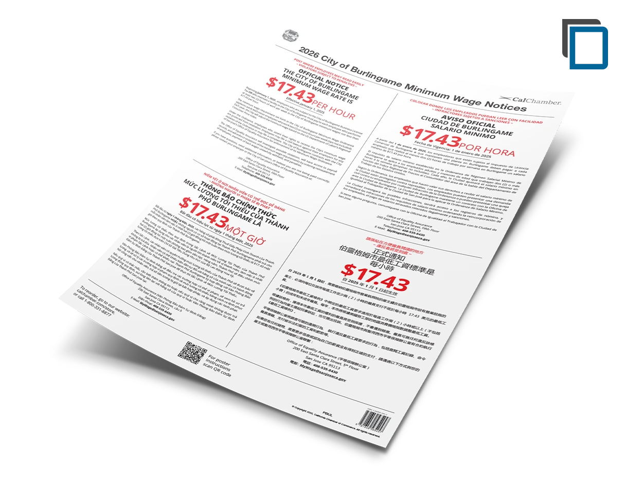 CalChamber’s 15.5" x 22" Burlingame Minimum Wage poster (English, Spanish, Chinese and Vietnamese combined) contains the official Burlingame Minimum Wage notice.