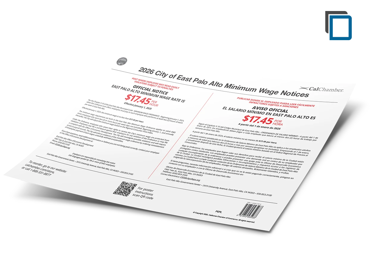 CalChamber’s 17"x 11" East Palo Alto Minimum Wage poster (English and Spanish combined) contains the official City of East Palo Alto Minimum Wage notice.