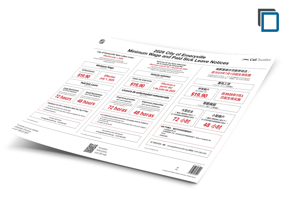 The Emeryville Labor Law Poster (24.5” x 16”) in English/Spanish/Chinese combined contains the official employment notices required by City of Emeryville’s Minimum Wage and Paid Sick Leave Ordinances. These notice obligations apply to all employers with employees, including part-time and temporary employees, who perform at least two hours of work in one calendar week in Emeryville. The poster must be posted in all languages spoken by 10 percent or more of your employees at a location. Next Required Update: July 1, 2025