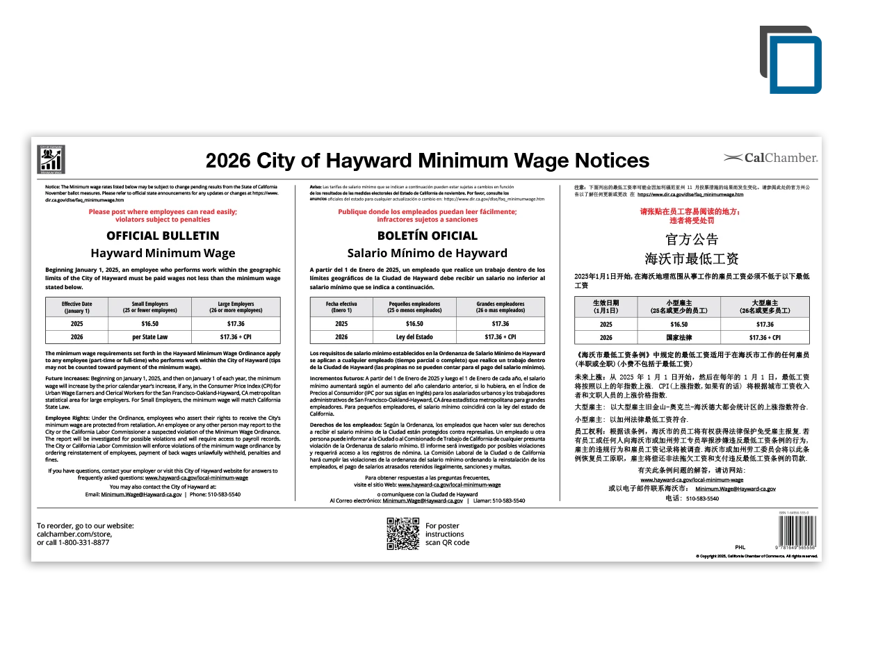 CalChamber’s 24" x 13" Hayward Minimum Wage poster contains the official City of Hayward Minimum Wage notice.