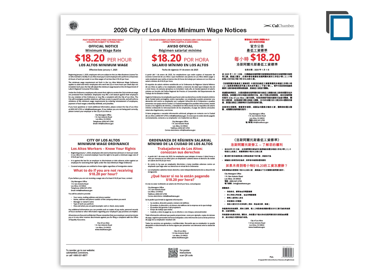 CalChamber’s 24” x 25” Los Altos Minimum Wage poster (English, Spanish, Chinese combined) contains these official employment notices as required by the City of Los Altos: