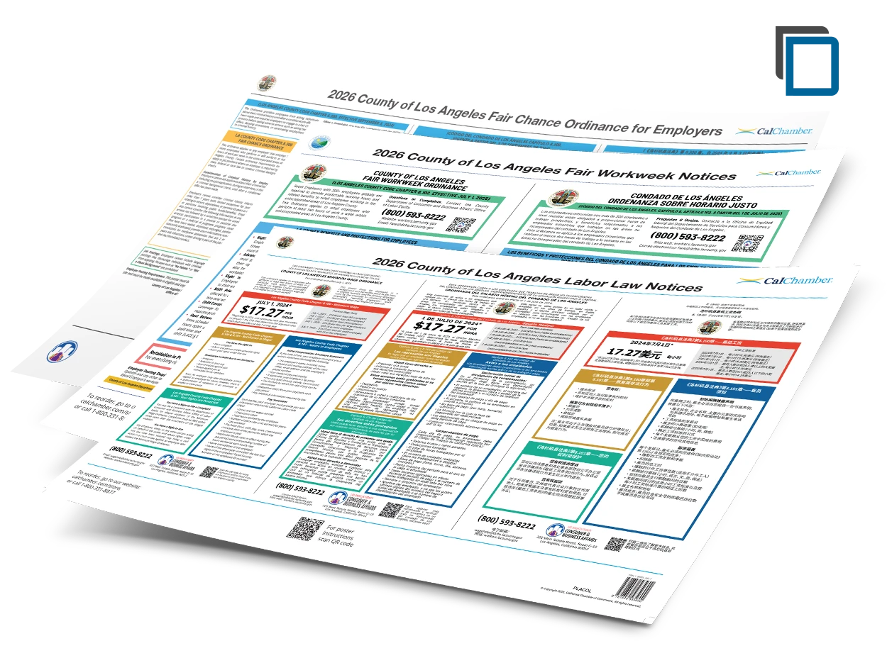 If you've previously purchased a County of Los Angeles Labor Law Poster dated prior to July 2025 from CalChamber, you’ll need to purchase a current County of Los Angeles Labor Law Notices Poster (Item PLACOL).