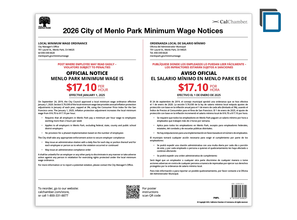 CalChamber’s 16" x 14" Menlo Park Minimum Wage poster (English and Spanish combined) contains the official City of Menlo Park Minimum Wage notice.