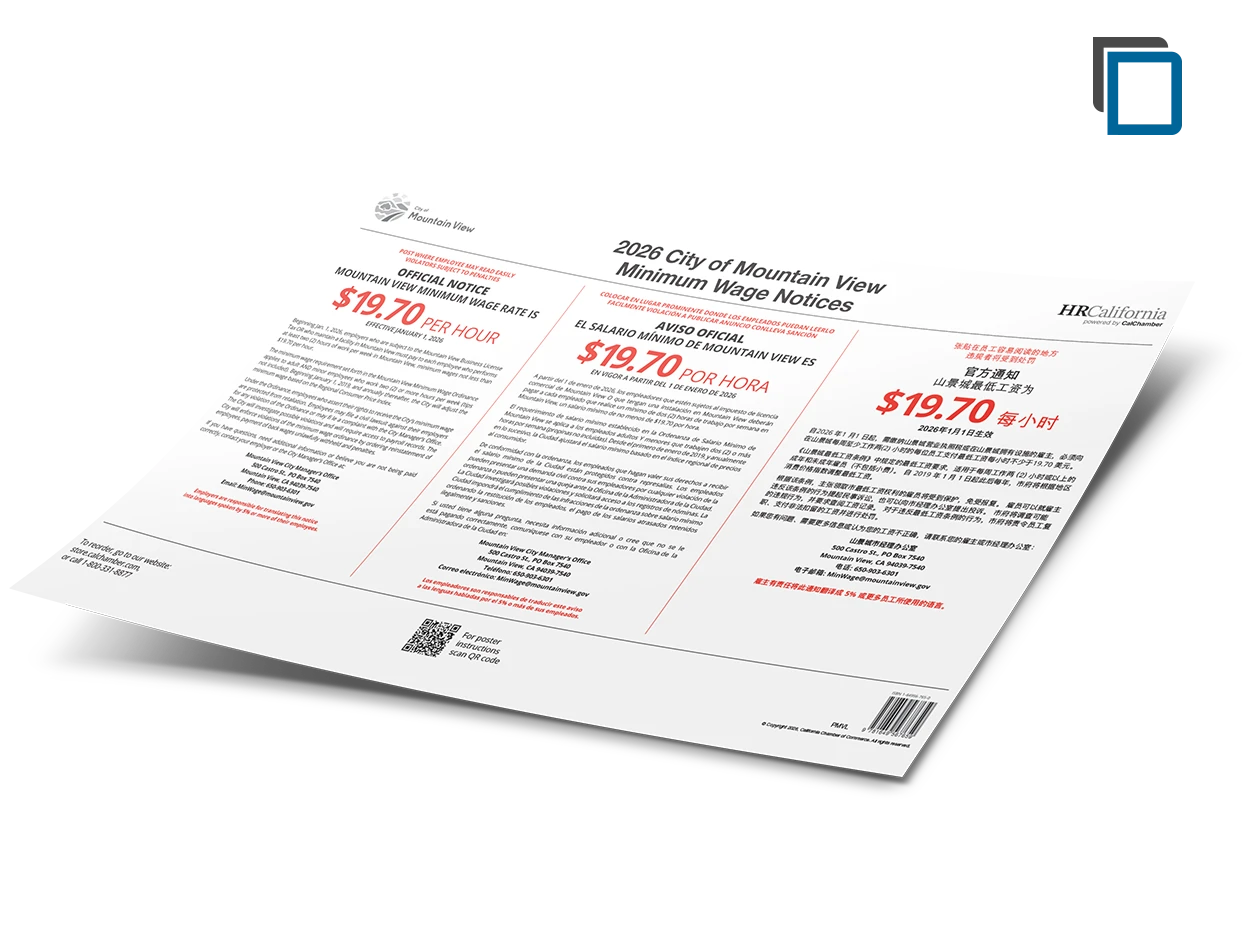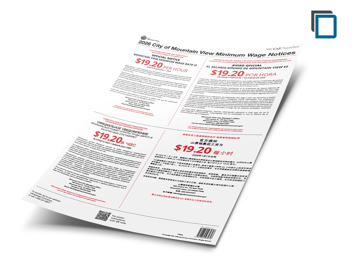 CalChamber’s 16” x 24” Mountain View Minimum Wage poster (English and Spanish combined) contains the official notice as required by the City of Mountain View Minimum Wage Ordinance.