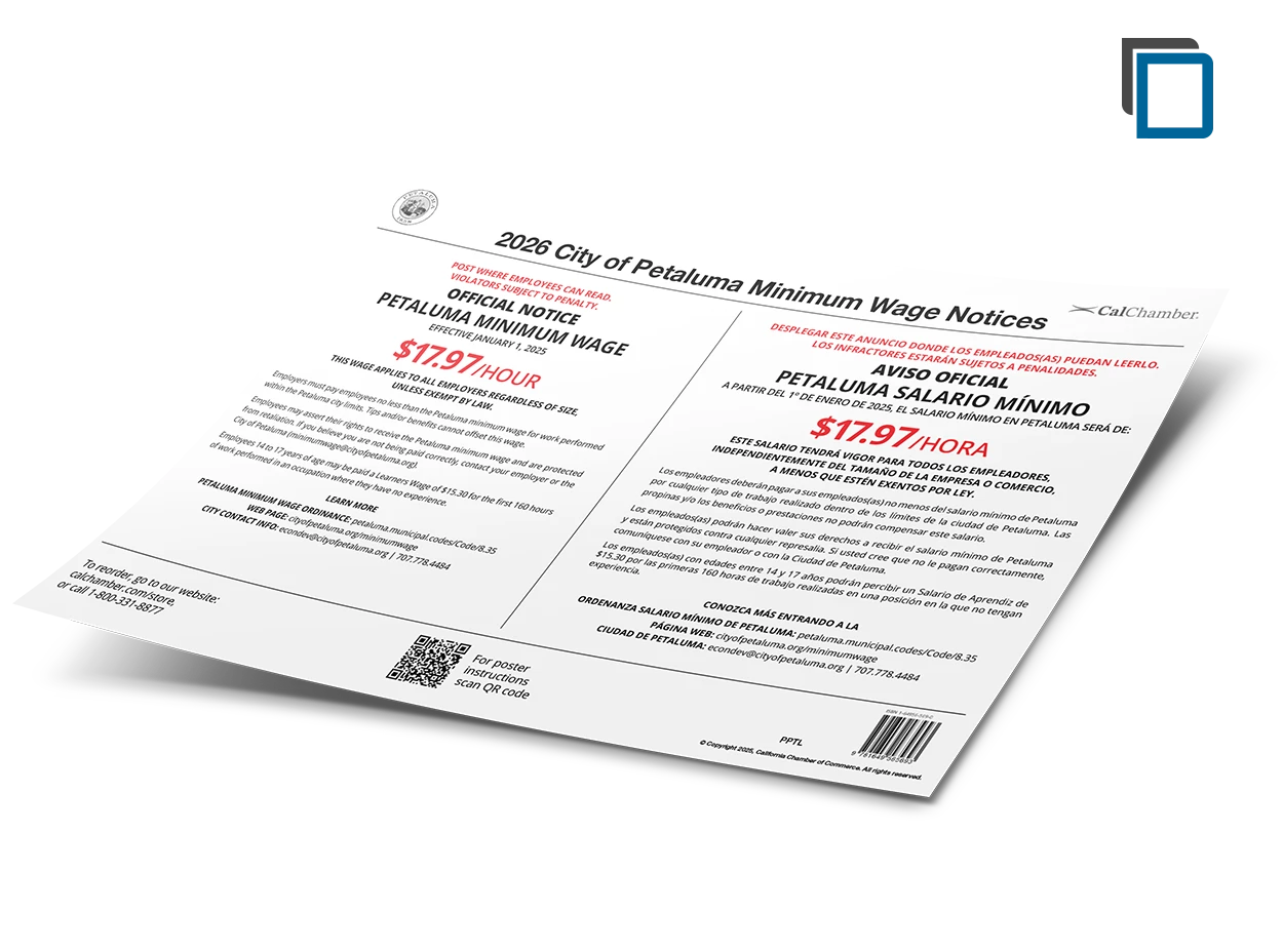 CalChamber’s 17" x 11" Petaluma Minimum Wage poster (English and Spanish combined) contains the official City of Petaluma Minimum Wage notice.