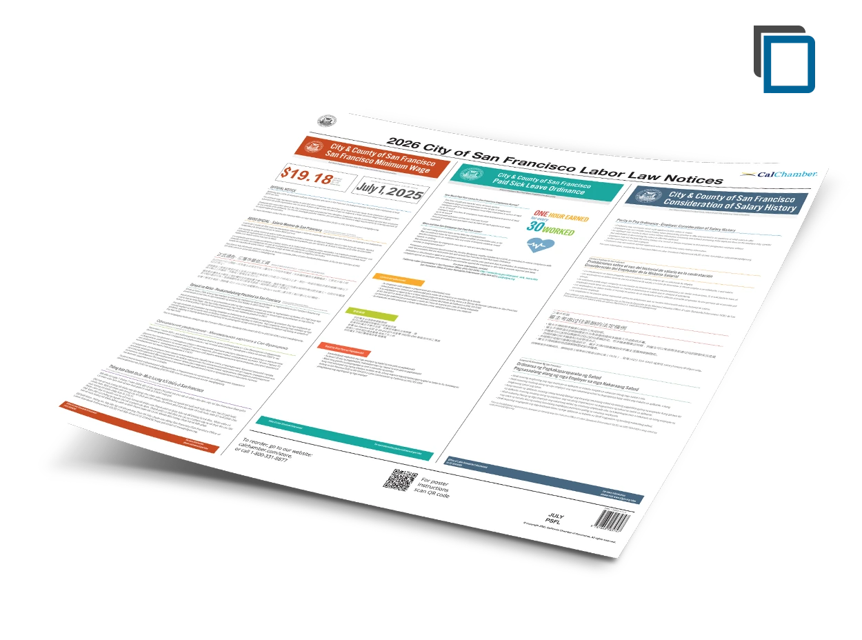 - If you've previously purchased a single San Francisco Labor Law Poster (1 to 4 employees) or poster sets prior to May 2025 from CalChamber, you’ll need to purchase the current San Francisco Labor Law Notice Poster (Item PSFL), which reflects the updated minimum wage notice, as described above.