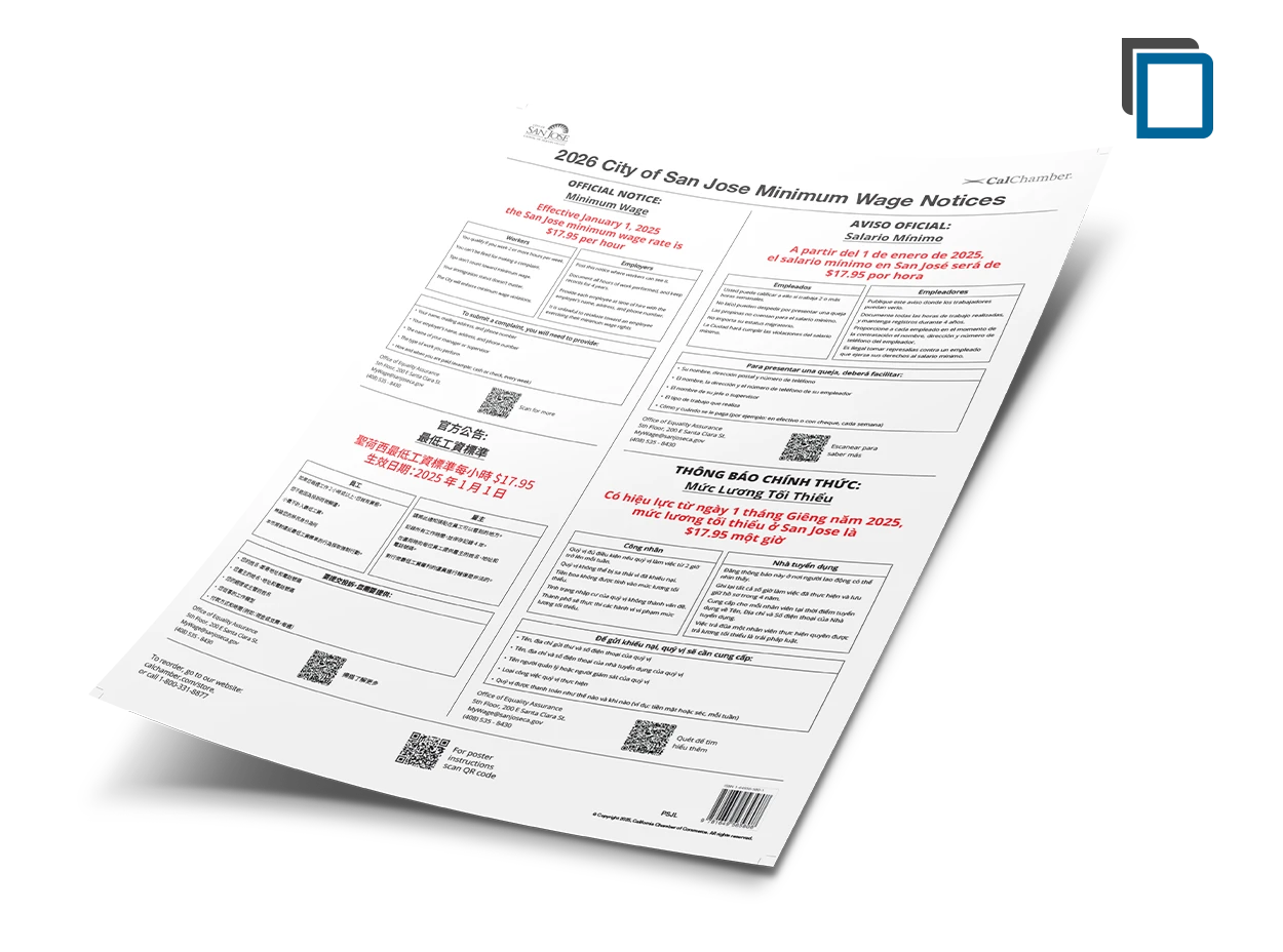 CalChamber’s 17" x 23" poster (English, Spanish, Chinese and Vietnamese combined) contains the official notice from the City of San Jose Office of Equality Assurance.