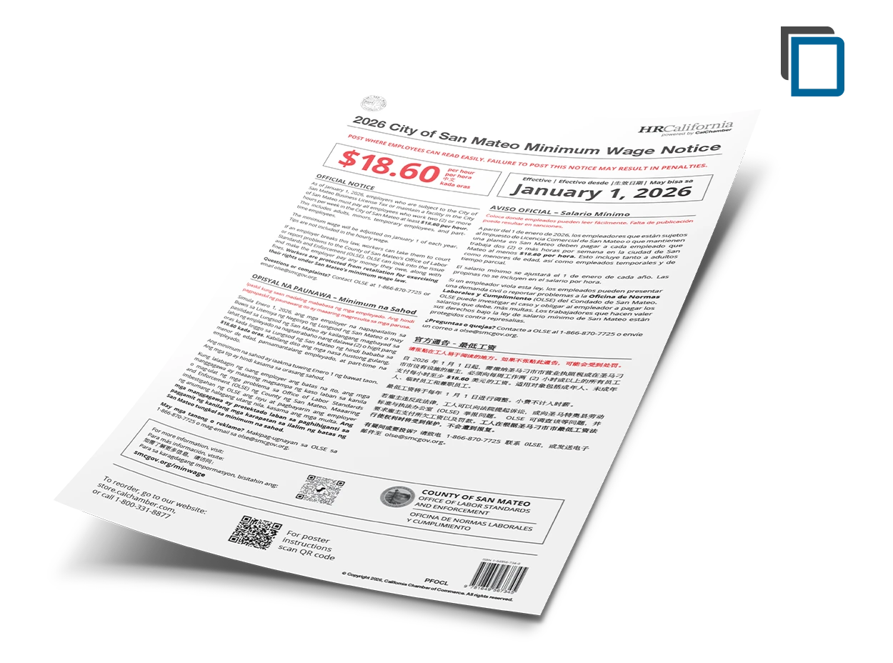 CalChamber’s 16” x 22” San Mateo Minimum Wage poster (English/Spanish combined) contains the official notices with the current minimum wage and minimum wage information as required by the City of San Mateo Minimum Wage Ordinance (MWO).
