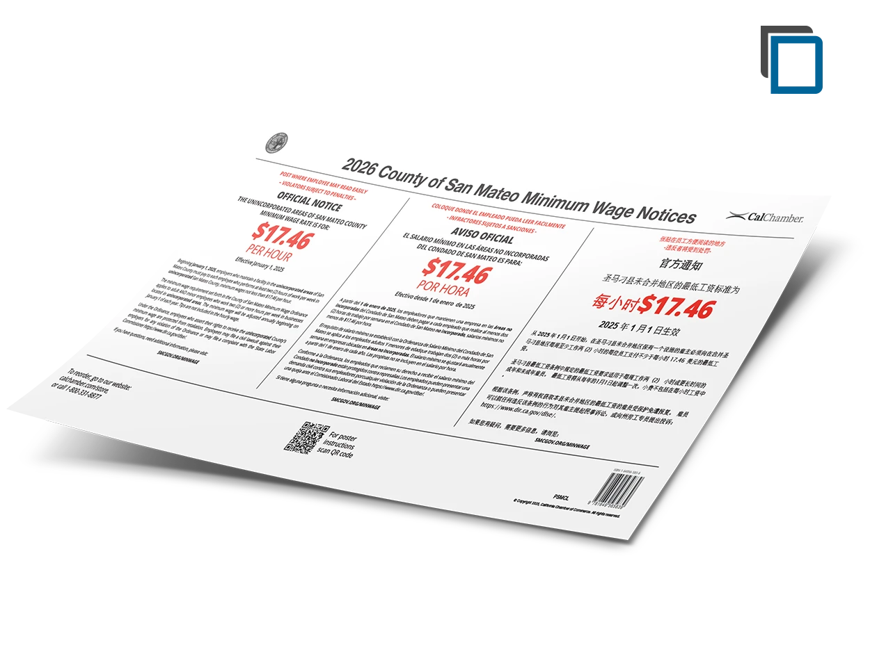 CalChamber’s 23.5" x 11" County of San Mateo Minimum Wage Poster (English/Spanish/Simplified Chinese combined) contains the official Minimum Wage Notice.