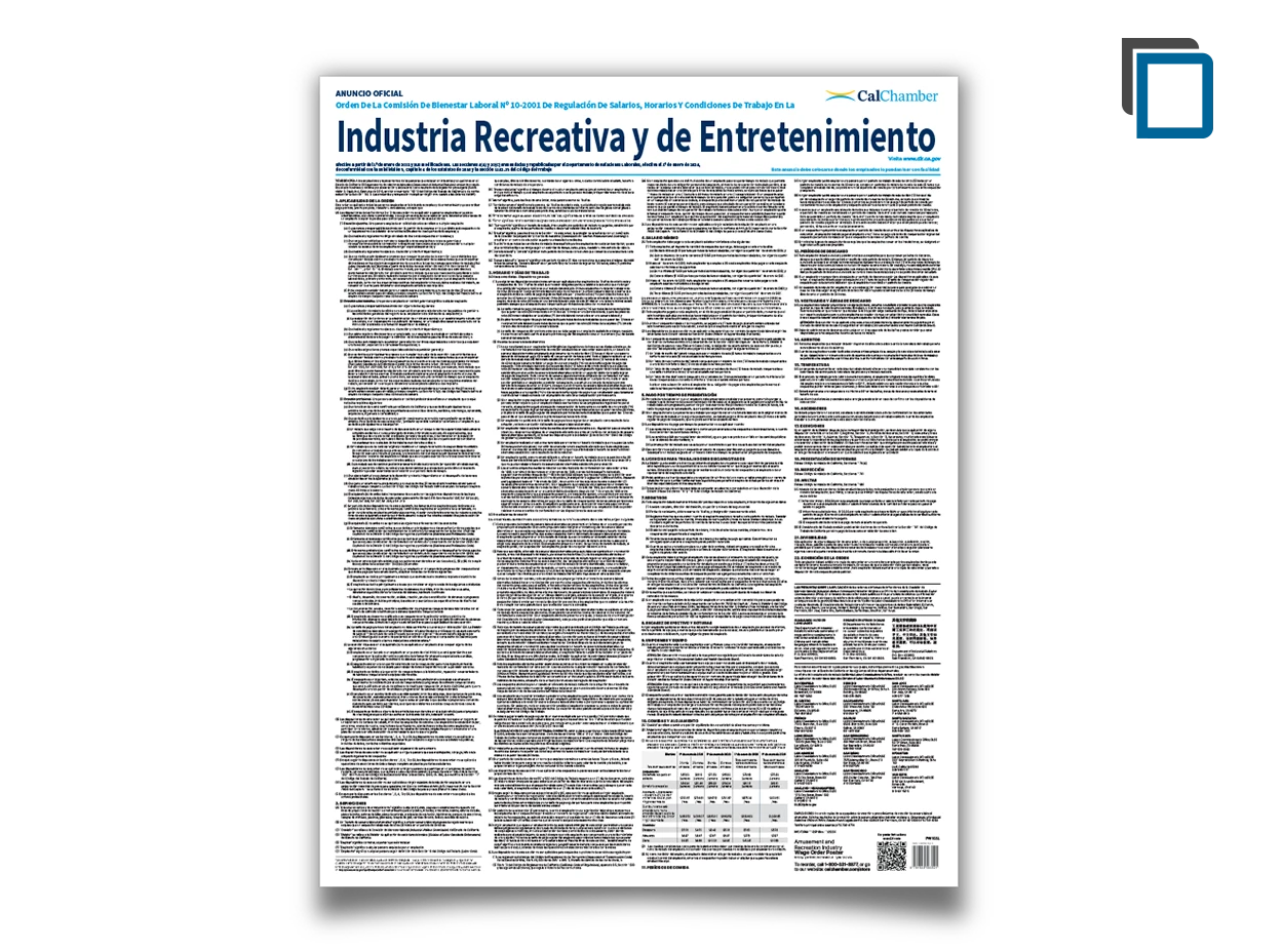 CalChamber’s laminated 27.5” x 38” English poster and 27.5” x 35.5” Spanish poster each combines the multiple pages of Wage Order 10 into one convenient poster. These posters are recyclable.