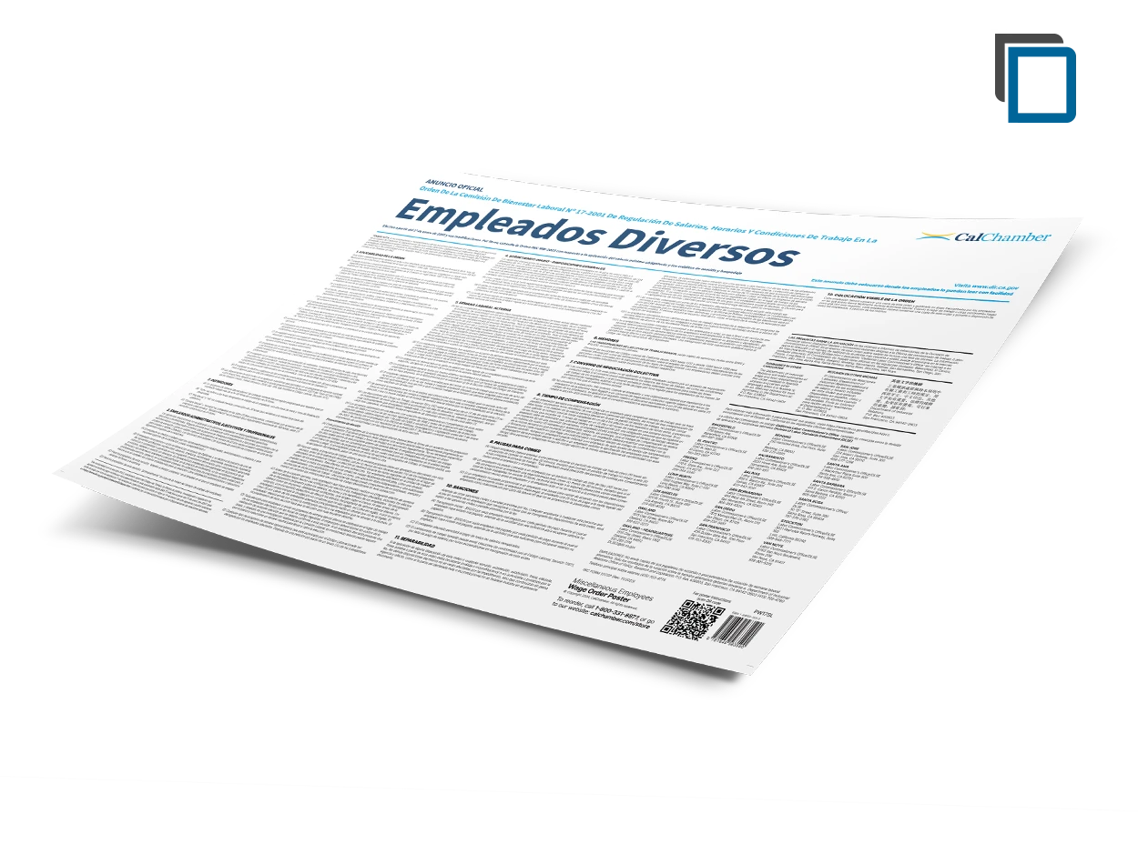 CalChamber’s laminated 27.5” x 21” English poster and 27.5” x 20” Spanish poster each combines the multiple pages of Wage Order 17 into one convenient poster. These posters are recyclable.