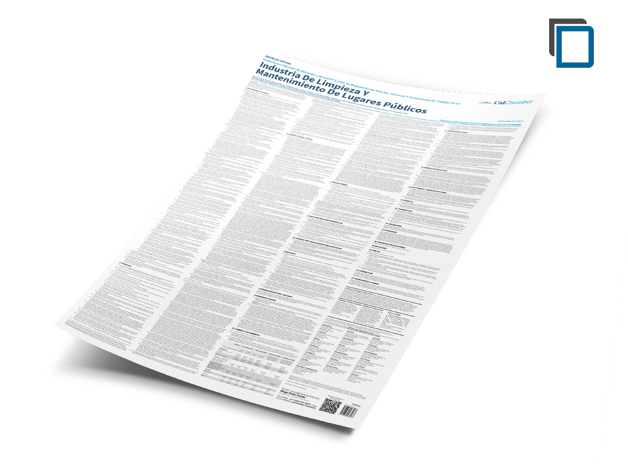 CalChamber’s laminated 27.5” x 39.75” English poster and 27.5” x 39.75” Spanish poster each combines the multiple pages of Wage Order 5 into one convenient poster. These posters are recyclable.