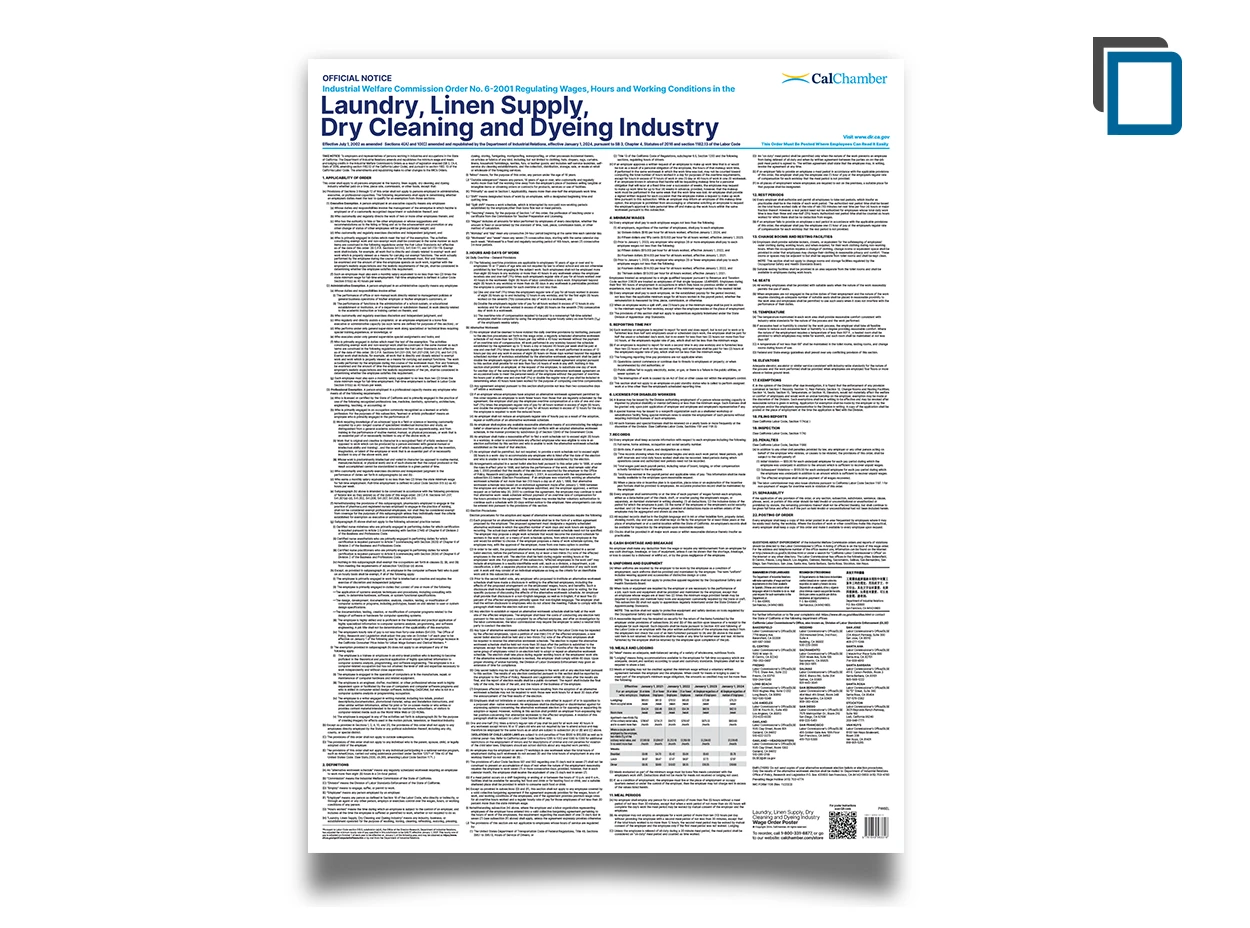 CalChamber’s laminated 27.5” x 37” English poster and 27.5” x 35.5” Spanish poster each combines the multiple pages of Wage Order 6 into one convenient poster. These posters are recyclable.
