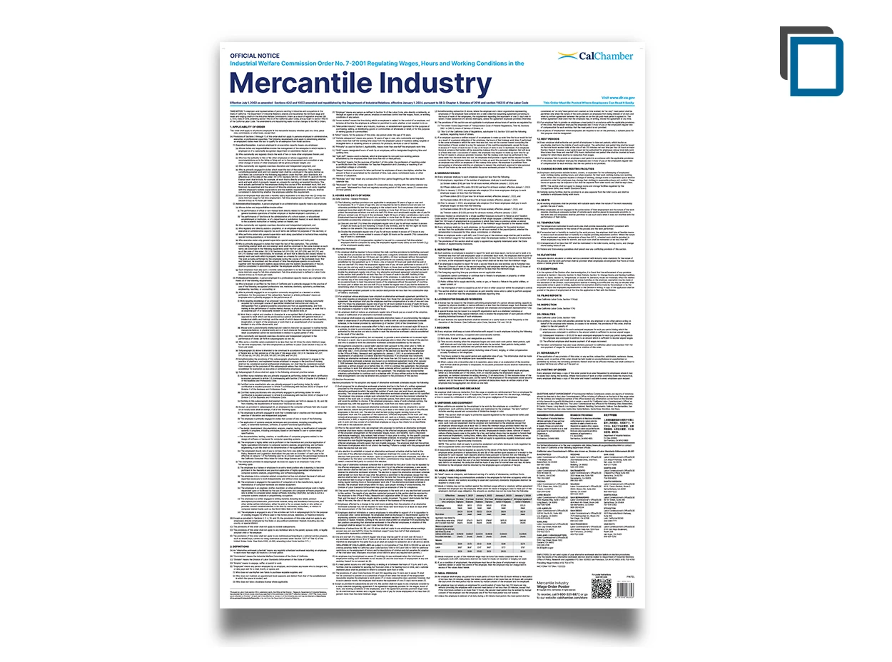 Wage Order 7 regulates wages, hours and working conditions in the Mercantile industry.