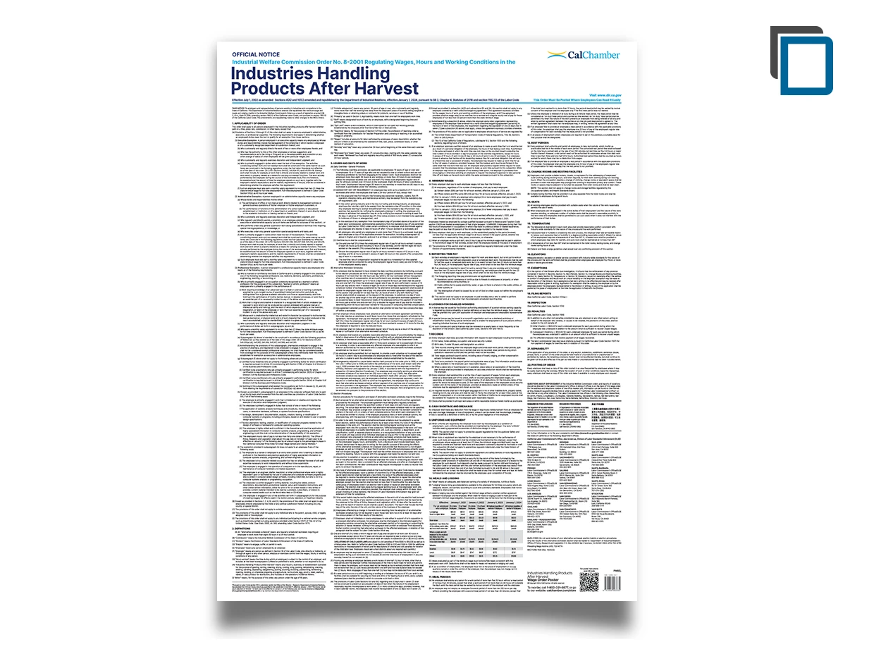 CalChamber’s laminated 27.5” x 38” English poster and 27.5” x 35.5” Spanish poster each combines the multiple pages of Wage Order 8 into one convenient poster. These posters are recyclable.