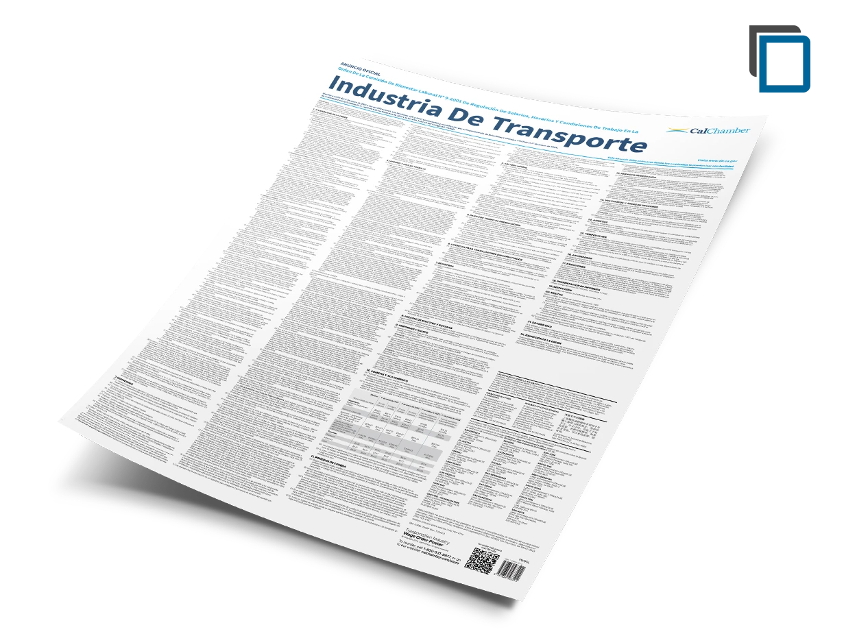 CalChamber’s laminated 27.5” x 38” English poster and 27.5” x 35.5” Spanish poster each combines the multiple pages of Wage Order 9 into one convenient poster. These posters are recyclable.